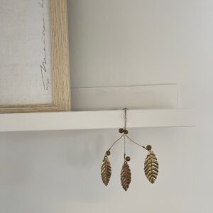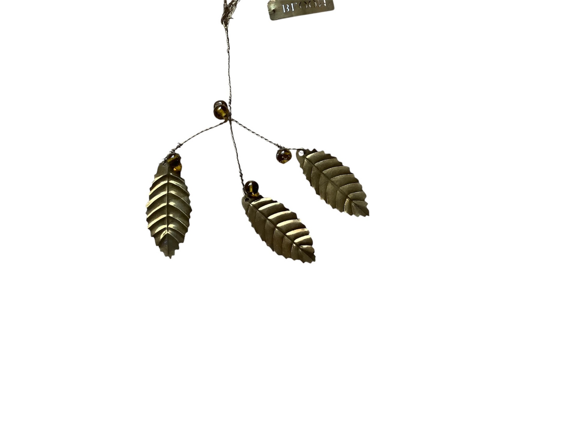 Metalen hanger met 3 blaadjes en oker kralen. Goudkleurig.