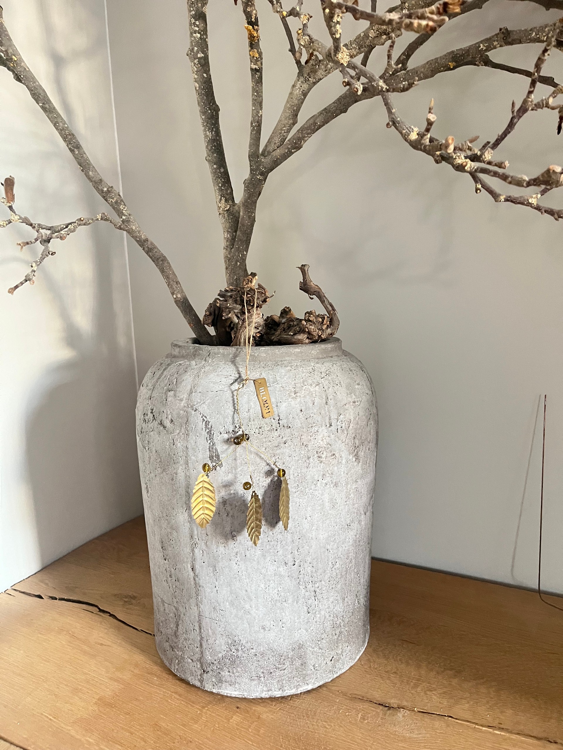 B: 10cm, H: 13 cm. Aan de hanger zit een oog en een dun gouden draadje.