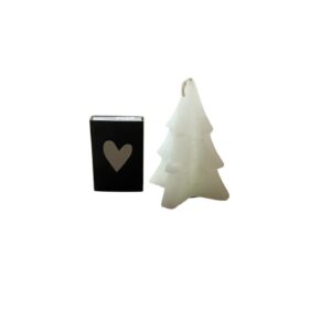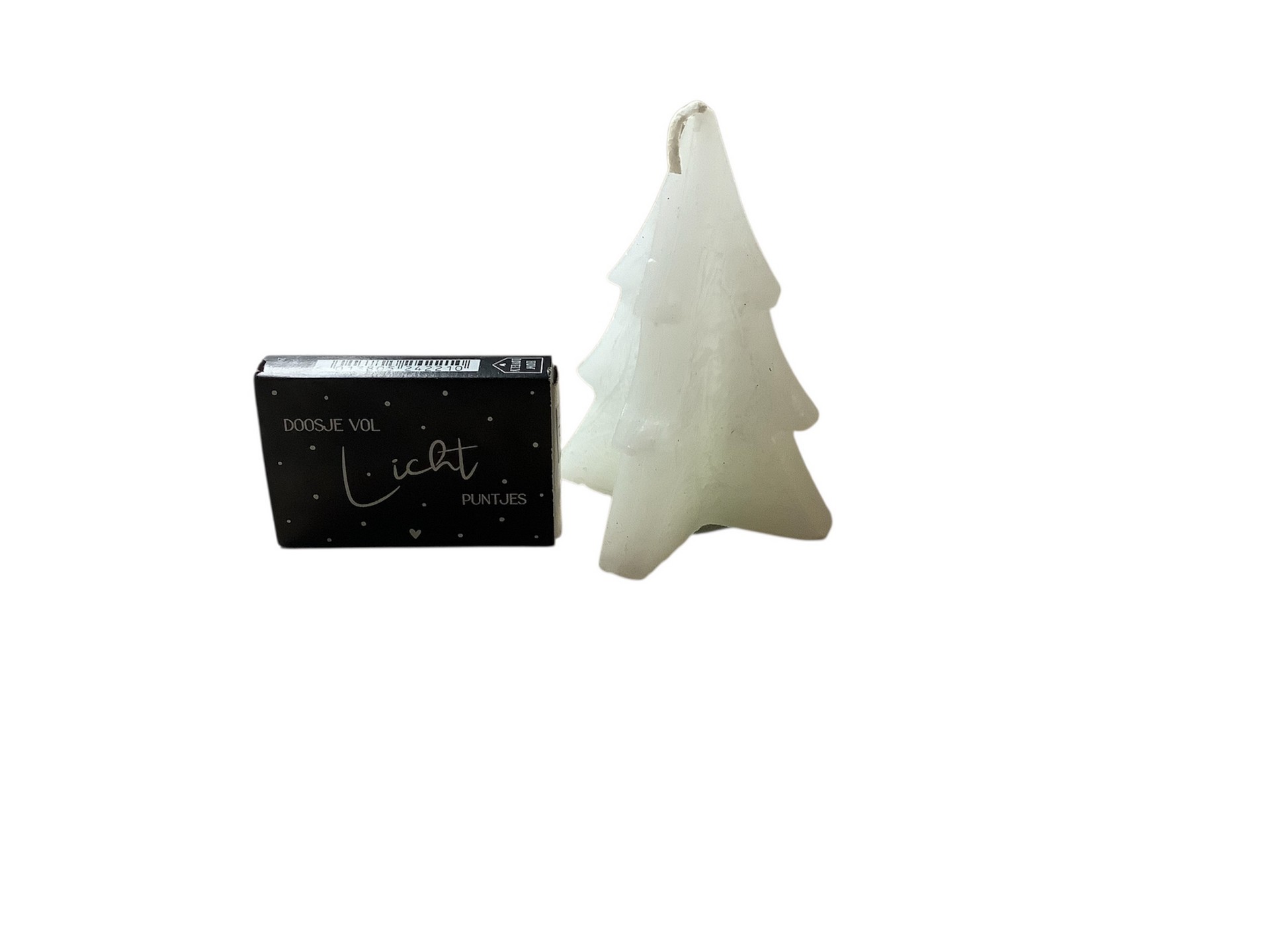De set bestaat uit een witte kerstboom kaars en een klein doosje met lucifers. Het zwarte doosje heeft aan de enen zijde een wit hart en op de andere zijde de tekst: doosje vol lichtpuntjes.