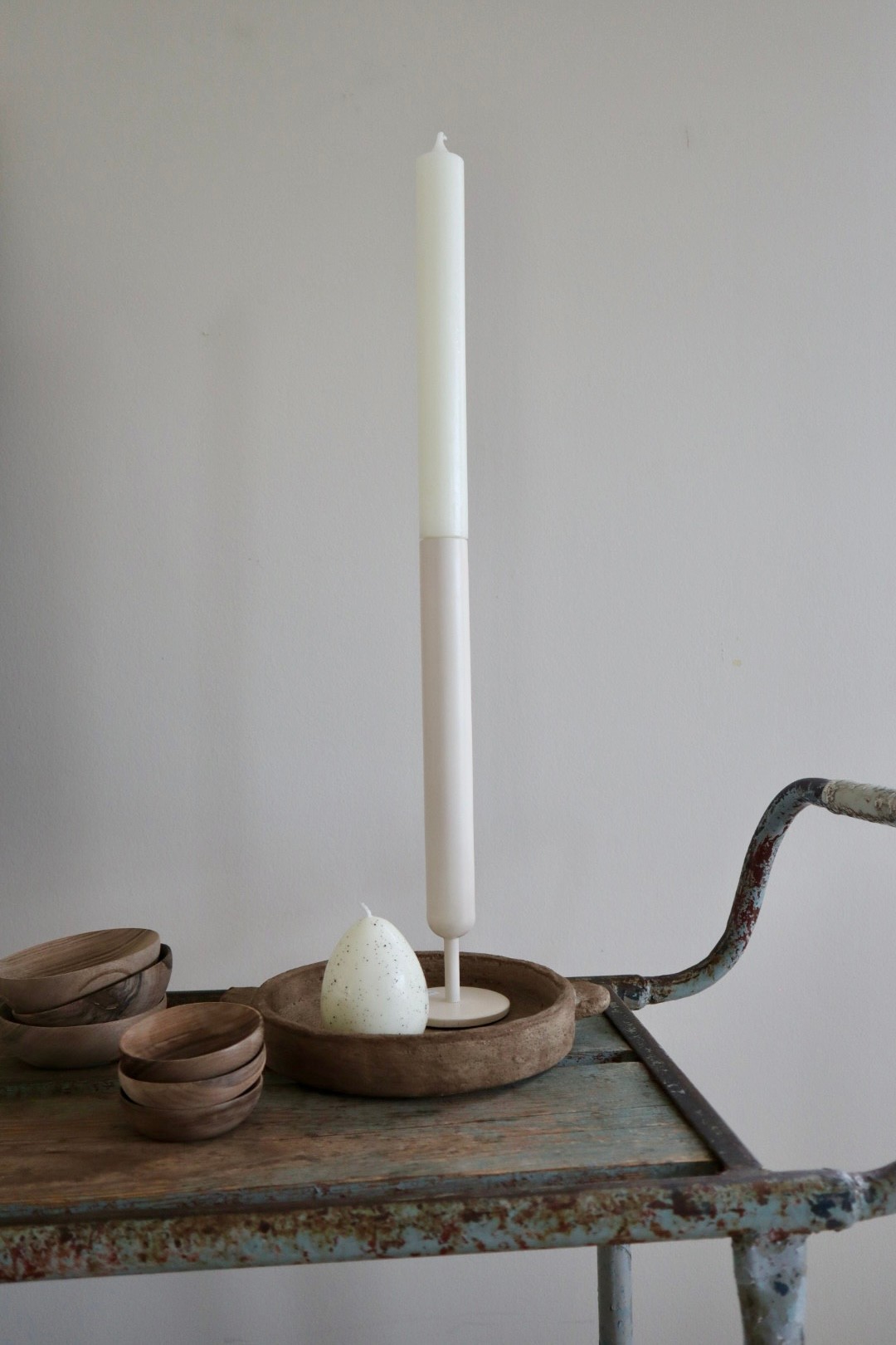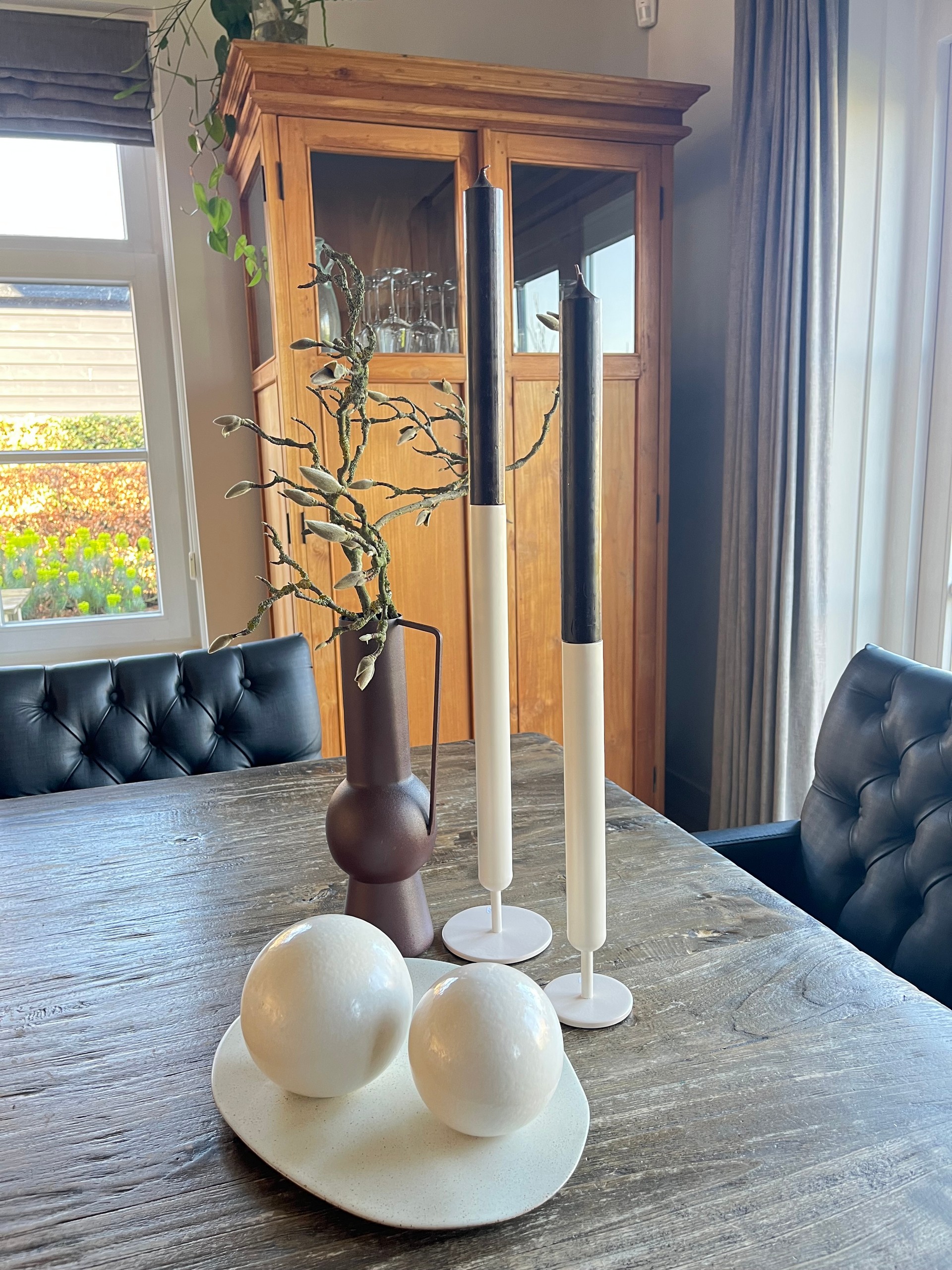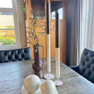 Een strak vormgegeven kandelaar van metaal. Prachtige match met de rustieke kaarsen uit onze collectie.