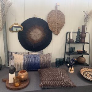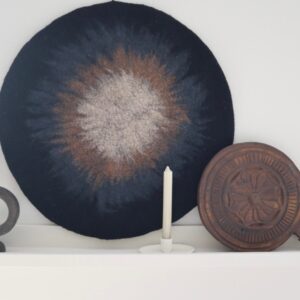 Ronde vilten wandhanger in donkerblauw, bruin en beige. Het is een uniek item waarmee je sfeer en rust creƫer in je interieur.